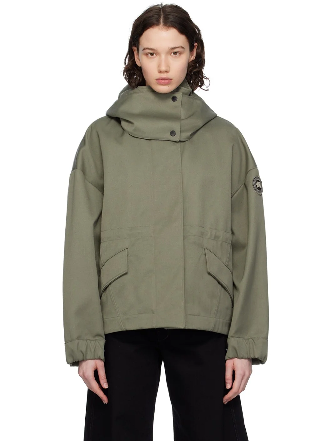 Polyester- and cotton-blend twill jacket. · Detachable hood at stand collar · Two-way zip closure with press-stud placket · Flap pockets · Droptail hem · Metal eyelets at underarms · Embroidered logo patch at sleeve · Adjustable press-stud tab at elasticized cuffs · Taped seams at interior · Patch pockets at interior · Bungee-style drawstring at interior waist · Partial twill lining Supplier color: Smokey sage Body: 67% polyester, 33% cotton. Lining: 100% polyester. Made in Bulgaria 241014F063006