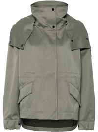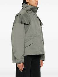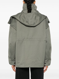 Olivine logo-applique jacket Highlights - Olive green - Twill weave - Logo-engraved buttons - High neck - Detachable hood - Drop shoulder - Long sleeves - Applique logo - Elasticated cuffs - Press-stud fastening cuffs - Metal eyelet detailing - Internal drawstring fastening waist - Two front flap pockets - High-low hem - Unlined - Front press-stud and zip fastening Imported Composition Outer: Polyester 67%, Cotton 33% Lining: Polyamide 100% SIZE & FIT Model measurements Height 5 ft 10 in(1.78 m) Bust/Chest 33.07 in(84 cm) Hips 36.61 in(93 cm) Waist 24.8 in(63 cm) FittingInformation Designed to be unstructured, offering a loose fit throughout The adjustable drawstring means that you can adjust this piece’s fit to suit your comfort and preference Made from a midweight non-stretch fabric This piece fits true to size – take your usual size Washing instructions Dry Clean Only