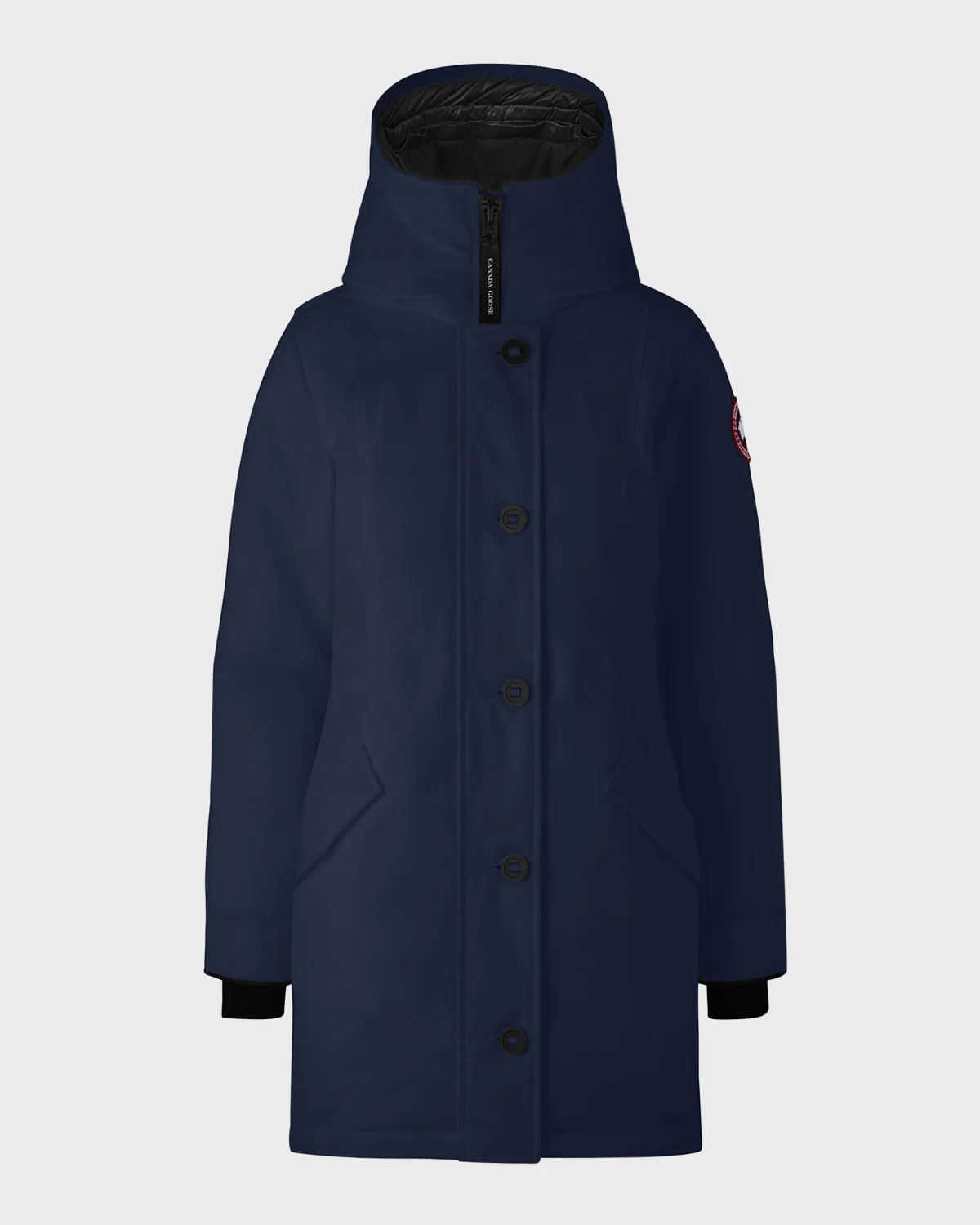 Canada Goose "Rossclair" parka crafted from durable arctic tech® fabric designed to face harsh elements Hooded stand collar Twoway zipper front; buttoned placket Long sleeves Flap pockets at sides Adjustable belted waist Back center slit Classic fit Midlength hem Polyester/cotton Lining: Recycled nylon Do not iron, dry clean only Made in Canada