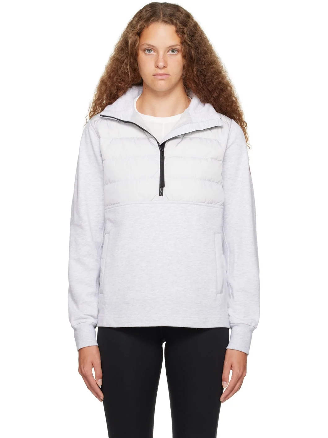Paneled down-filled quilted HyBridge® nylon taffeta and french terry sweatshirt. Breathable. · Stand collar · Half-zip closure · Kangaroo pocket · Logo patch at sleeve · Rib knit cuffs · Partial taffeta lining Supplier color: Silverbirch Fill: 90% down, 10% feather. Body 1: 100% cotton. Body 2: 100% polyamide. Lining: 100% polyamide. Made in Romania 232014F061020