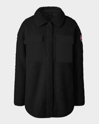 Canada Goose "Simcoe" lightweight sherpa shirt jacket crafted with Kind High Pile Fleece fabric Foldover collar Concealed front snapclosure buttons Long sleeves; selfbound cuffs Signature logo disc at left sleeve Two flap chest pockets with snap closures Two zippered sideentry pockets Midlength Relaxed fit Wool/polyester/nylon/polyamide Do not iron, dry clean Made in Albania