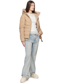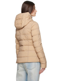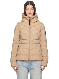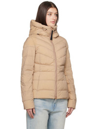 Down-filled and quilted stretch nylon taffeta jacket. Lightweight, wind-resistant, and water-repellent. · Bungee-style drawstring at hood · Funnel neck · Two-way zip closure · Zip pockets · Embroidered logo patch at sleeve · Logo-woven shoulder straps at interior · Zip pocket at interior · Fully lined Part of the Black Label collection. Supplier color: Desert sand Fill: 90% duck down, 10% duck feather. Body: 87% polyamide, 13% elastane. Lining: 87% polyamide, 13% elastane. Made in Canada 251014F061018