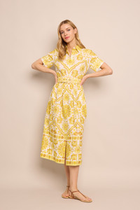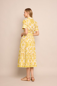 • Button down short sleeve midi shirt dress with belt • Center front functional placket opening • Functional side seam pocket bags • Button opening at sleeve cuff • Darts at front and back bodice for a fitted look • Designed for a fit and flare silhouette • Placed print • Belt is removable • Belt features a raffia belt buckle • Unlined Details • 100% Cotton Poplin • Dry Clean Only or Hand Wash Cold • Made in China