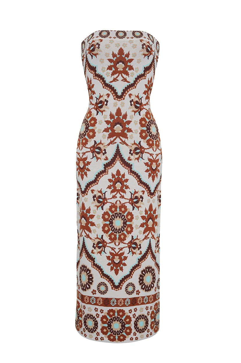 • Tube sheath dress with an elasticated band at the top and engineered jacquard pattern • Side slits on both sides • Center back gold zip for decoration • Slips on Details • 63% Viscose 37% Nylon • Dry Clean Only or Hand Wash Cold • Made in China