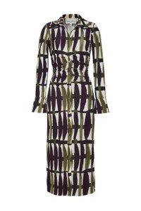 • Slinky jersey midi shirt dress designed for a fitted look • Decorative side panels with ruching detail at waist • Placed print • Side seams at center front and center back • Functional center front placket with baby snaps at interior • Sleeves have fluted cuff with bungee elastic and self covered buttons at the top opening of the cuff • Slits on side seams This garment is special and might stretch over time if hung. To preserve its shape, we recommend taking extra care and folding. Details • 93% Viscose 7% Spandex • Dry Clean Only or Hand Wash Cold • Made in China