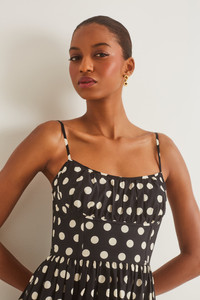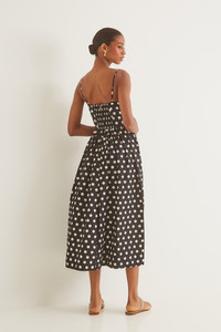 • Midi length fit-and-flare with adjustable spaghetti straps and ruched bodice • Bodice features exposed boning at princess and side-seams • Center back zipper opening with hook-and-eye • Back bodice features smocked panel for adjustability • Side-seam pocket bags • Bodice is lined in self fabric, skirt is unlined • Allover print Details • 100% Cotton Poplin; 100% Cotton Voile Lining • Dry Clean Only or Hand Wash Cold • Made in China