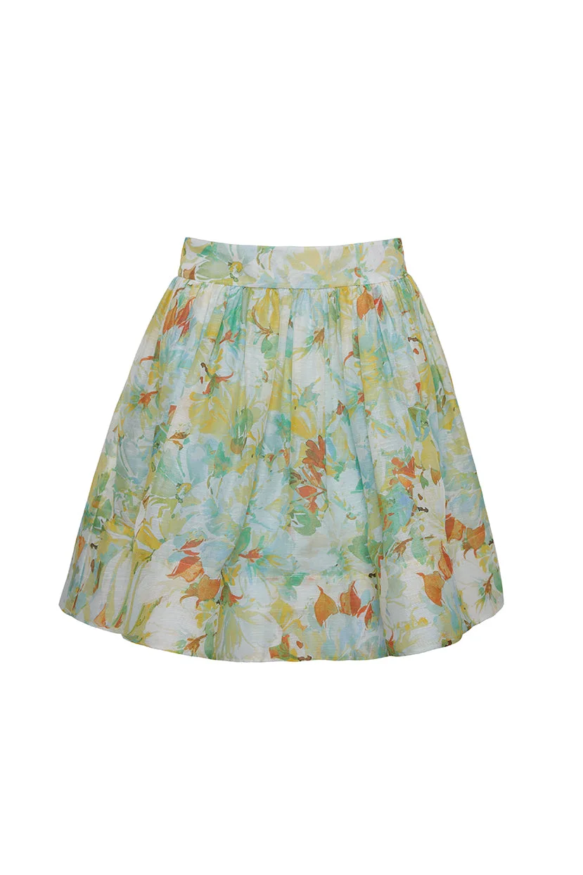 • Babydoll fit-and-flare mini skirt • Fully lined • Center back zipper opening with hook-and-eye closure • Comes with removable, separate self belt with raffia belt buckle • Waistband has belt loops for belt to slide through • Side seam pocket bags • Hem has interior horsehair trim for more kick • Allover print Details • Silk Linen Organza 52% Linen 48% Silk • Dry Clean Only or Hand Wash Cold • Made in China