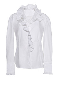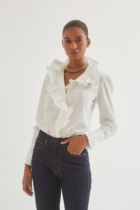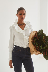 The shirting capsule was created to add effortless glamour to casual looks. The Anne is our more elegant top, featuring a ruffle trim collared neckline, long sleeves and button cuffs and front. The relaxed fix, yoked back and shirttail hem effortlessly elevates any pair of jeans or skirt. Details • 100% Cotton Poplin • Dry Clean Only or Hand Wash Cold • Made in Peru