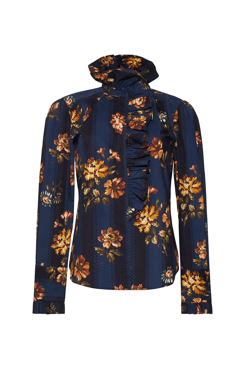 Created to add effortless glamour to casual looks, the Anne is our more elegant top, featuring a ruffle trim collared neckline, long sleeves and button cuffs and front. The relaxed fix, yoked back and shirttail hem effortlessly elevates any pair of jeans or skirt. Allover print. Details • 100% Cotton Poplin • Dry Clean Only or Hand Wash Cold • Made in China