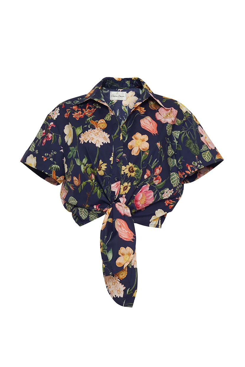 A reimagined classic short sleeve button up, the Asbury Top adds an extra dose of ease and glamour to an everyday basic. The cropped shirt features a button opening, cuffed sleeve and a front tie bow detail. Cropped button down shirt with front button opening. Tie front bow detail. Short sleeve with cuff. Elastic at back hem for adjustability. Unlined. Allover print. Details • 100% Cotton Poplin • Dry Clean Only or Hand Wash Cold • Made in China