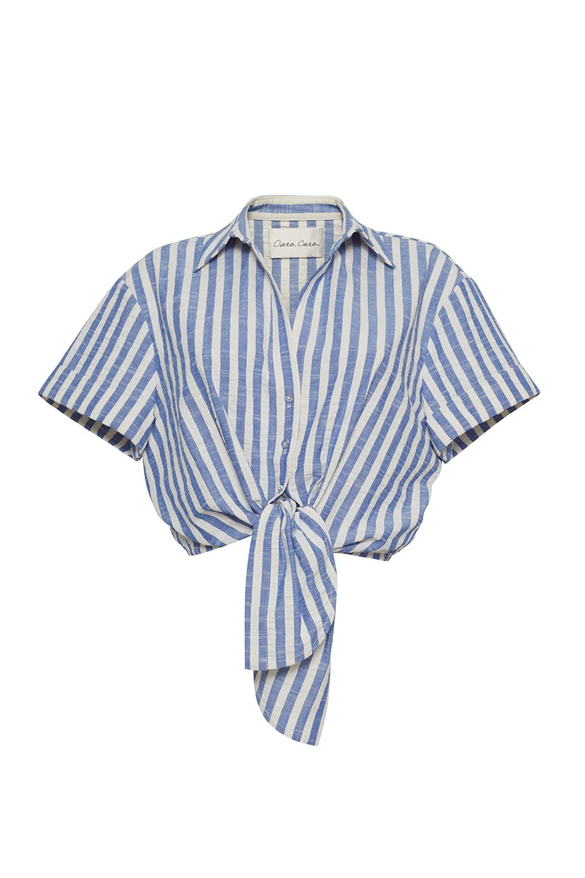 A reimagined classic short sleeve button up, the new Asbury Top adds an extra dose of ease and glamour to an everyday basic. The cropped shirt features a button opening, cuffed sleeve and a front tie bow detail. Cropped button down shirt with front button opening. Tie front bow detail. Short sleeve with cuff. Elastic at back hem for adjustability. Unlined. Details • 50% Viscose, 36% Cotton, 14% Polyamide • Dry Clean Only or Hand Wash Cold • Made in China