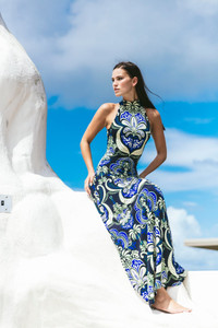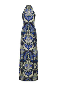 • Halter maxi jersey dress with a slim fit and slightly flared skirt • Center back invisible zipper with hook-and-eye at top edge • Mock neck • Top stitching detail at hem • Unlined • Placed print Details • 93% Viscose 7% Spandex • Dry Clean Only or Hand Wash Cold • Made in China