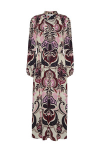 • Tie-neck, waisted easy midi dress. • Placed print • Tunneled waist with self-ties for an adjustable, flattering fit • Printed silk crepe • Elastic encased at sleeve cuff • Gold metallic cord ends • Partially lined at skirt Details • 100% Viscose • Dry Clean Only or Hand Wash Cold • Made in India