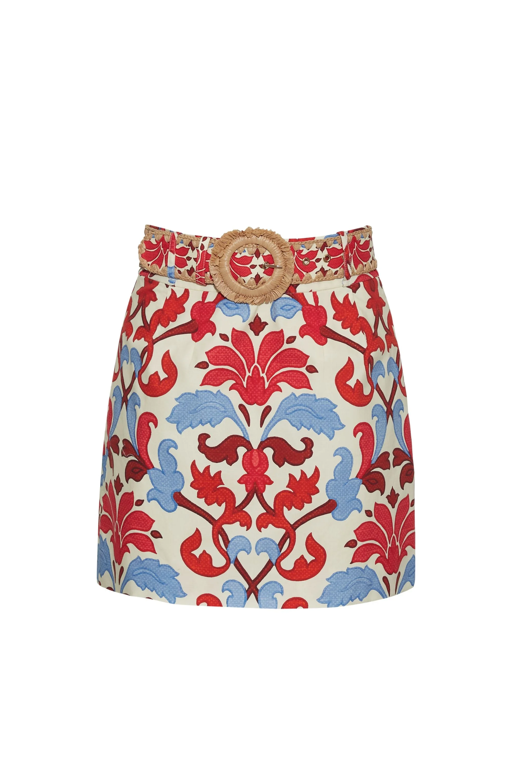 • Mini fitted skirt designed for a slight a-line look • Darts at front and back for a fitted look around the waist • Features a tall waistband with belt loops • Can be worn with its matching novelty raffia belt • Center back zipper opening with hook-and-eye • Fully lined • Placed print at skirt • Special artwork at belt Details • 100% Cotton; 100% Cotton Voile Lining • Dry Clean Only or Hand Wash Cold • Made in China