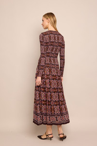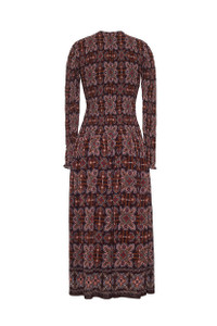 • Fully smocked bodice and long sleeve crewneck midi dress with drop-waist and gathering below waist seam • Fully lined except for sleeves • Sleeve hem has ruffle detail • Center back hidden zipper with hook-and-eye closure at top opening • Placed print with border at hem Details • 100% Viscose • Dry Clean Only or Hand Wash Cold • Made in India