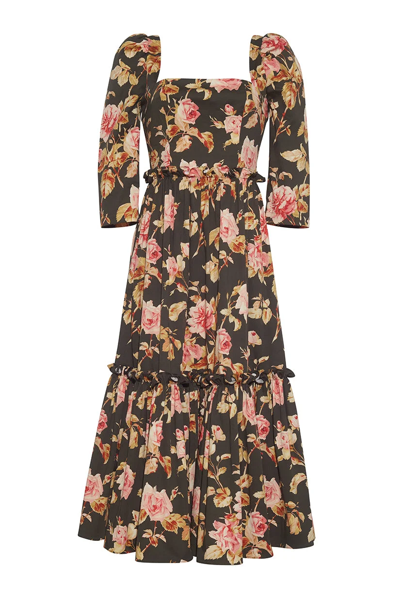 Designed in a dazzling floral print, the refreshed cotton sateen Blue Hill cuts an elegant silhouette with structured sleeves and a ruffle tier. Pair with heels and jewels for an evening out or ankle boots for casual days. Square neckline. Smocked back. Three-quarter sleeves. A-line silhouette. Hem falls below the knee. Concealed zipper fastening along the back. Details • 97% Viscose 3% Spandex • Dry Clean Only or Hand Wash Cold • Made in China