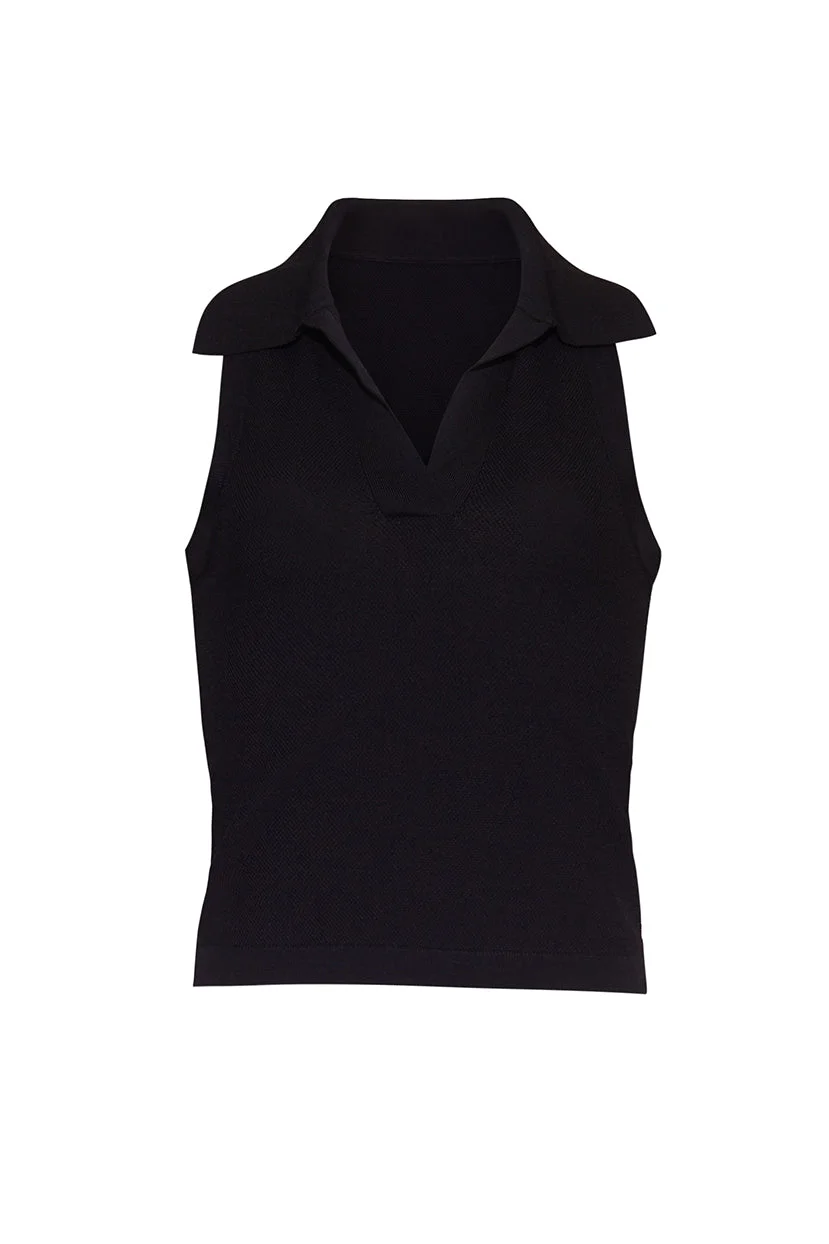 • Collared sleeveless fit and flare fitted top • Racerback • Slick knit • Novelty pique Details • 83% Viscose 17% Poly + Spandex • Dry Clean Only or Hand Wash Cold • Made in China