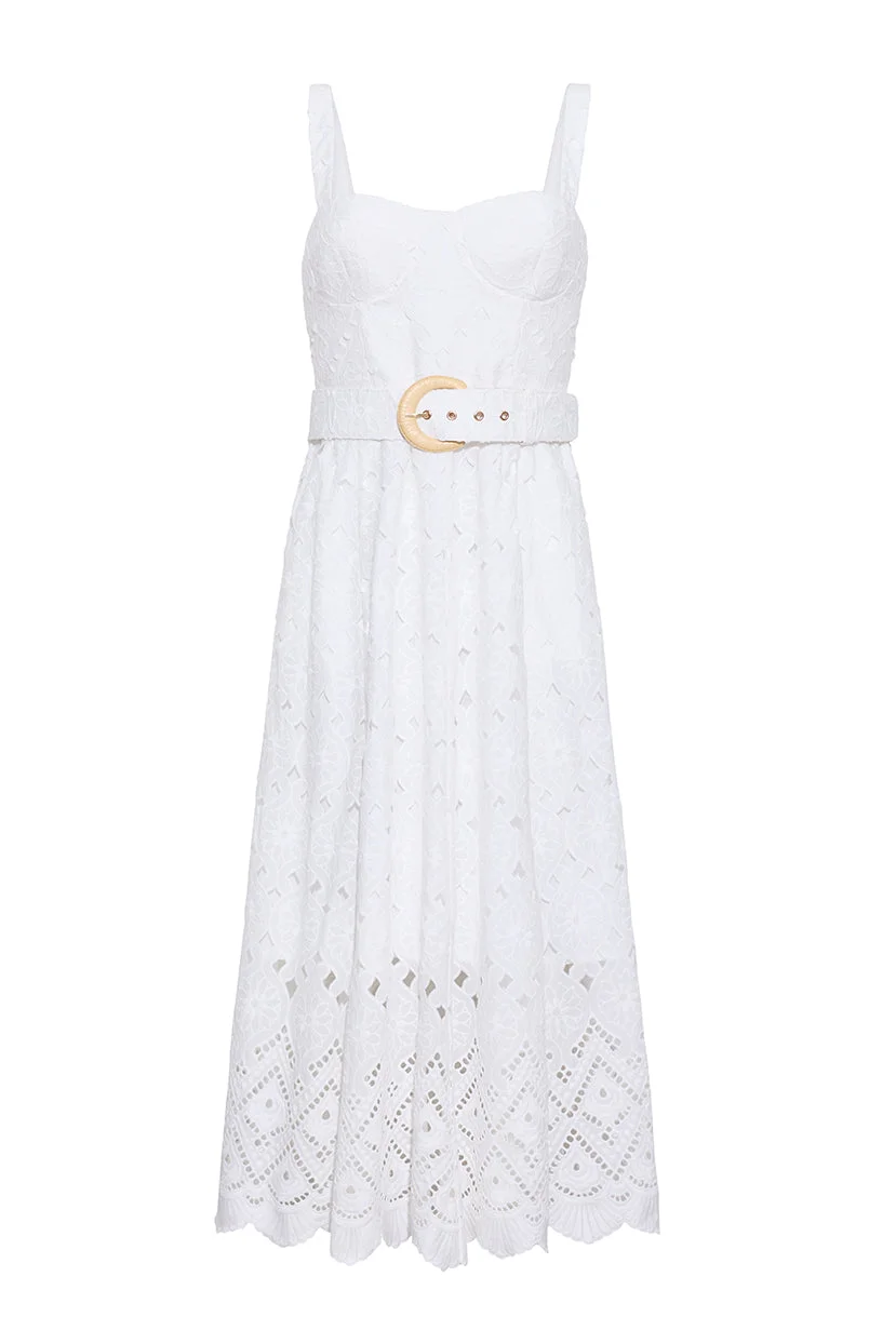• Fit and flare midi dress • Corset top with elastic at the back of the straps, boning and metal underwire for support • Bodice and bra cups are fully lined • Sweetheart neckline • Self covered belt with a raffia buckle • Back smocked panel with center back zipper • Straps have elastic in the back • Placed eyelet • Hem features a decorative scallop detail • Skirt has princess seams at front and back • Half lining at skirt Details • 100% Cotton • Dry Clean Only or Hand Wash Cold • Made in China