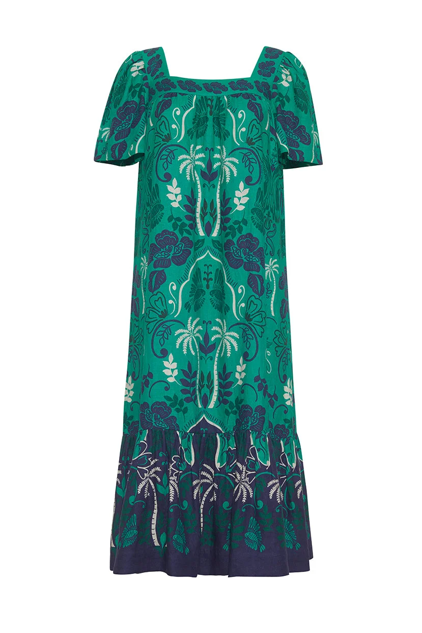 Designed in our elegant island print, the Chani Dress is a fresh and effortless silhouette. The square neckline and puff sleeves add structure and beautifully contrast the flowy linen silhouette with ruffle tier. Pair with knee high boots for a haute bohemian look or team with flats for casual-chic days. Ruffle-tiered midi tunic dress with short puff sleeves and square neck. Unlined. Slips on. Placed print. Details • 100% Cotton Linen • Dry Clean Only or Hand Wash Cold • Made in India