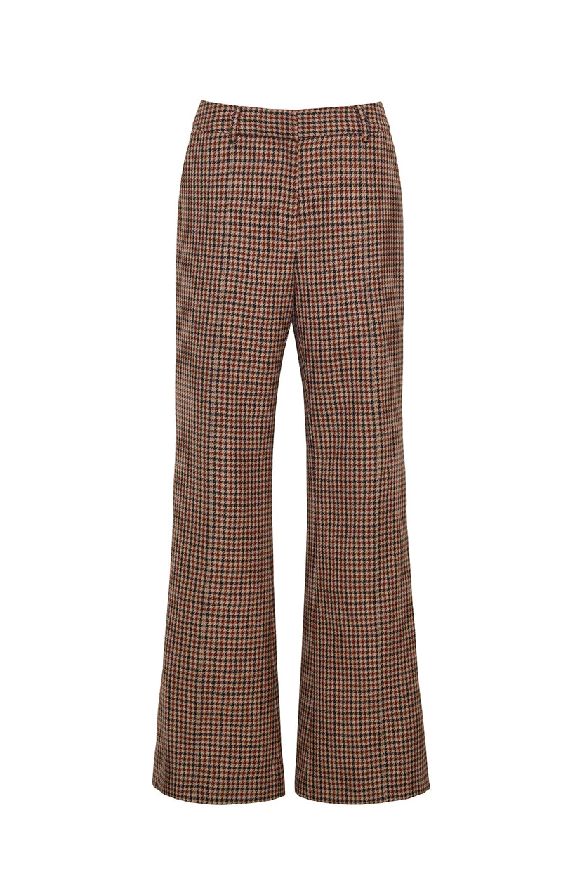 • Flared full length pant in houndstooth plaid fabric • A flared silhouette at the bottom of the leg opening • Menswear interior waistband facing • Functional slant pockets at side seam • Functional welt pockets at back • Pintucks running down pant leg • Fly zipper front opening with hook and bar closure at waistband Details • 100% Wool • Dry Clean Only or Hand Wash Cold • Made in China