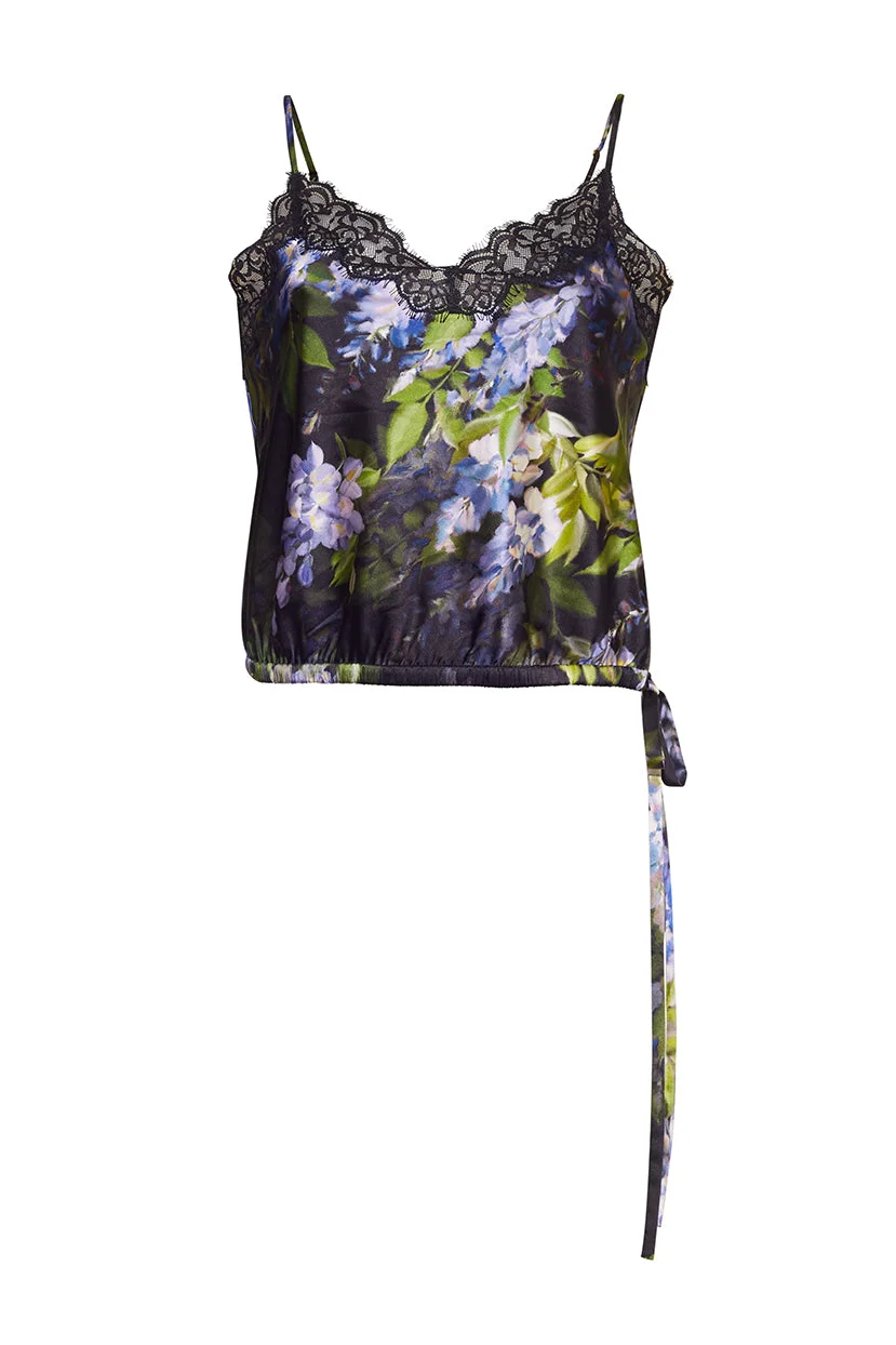 • Lace cami with adjustable straps • Elastic waistband with ties • Chantilly lace detail along neckline • Cut on bias • Viscose silk twill • Unlined Details • 51% Viscose 49% Silk • Dry Clean Only or Hand Wash Cold • Made in China