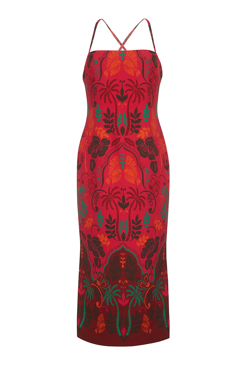 A fresh silhouette for warm weather is the stunning Dria Dress. Featuring spaghetti straps, a straight neckline, and a pencil skirt with side slits, this tailored dress is easy to dress up or down for any occasion. Tailored fit. Side slits. Adjustable straps. Midi hem. Zip fastening with hook and eye. Scoop back. Lined down to hem. Placed print. Details • 96% Viscose 4% Spandex • Dry Clean Only or Hand Wash Cold • Made in China