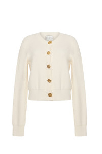 • Crewneck fitted long-sleeve cardigan with novelty gold floral buttons Details • 70% Wool 30% Cashmere • Dry Clean Only or Hand Wash Cold • Made in China