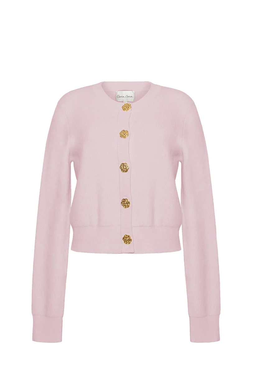 • Crewneck fitted long-sleeve cardigan with novelty gold floral buttons This garment is special and might stretch over time if hung. To preserve its shape, we recommend taking extra care and folding. Details • 70% Wool 30% Cashmere • Dry Clean Only or Hand Wash Cold • Made in China