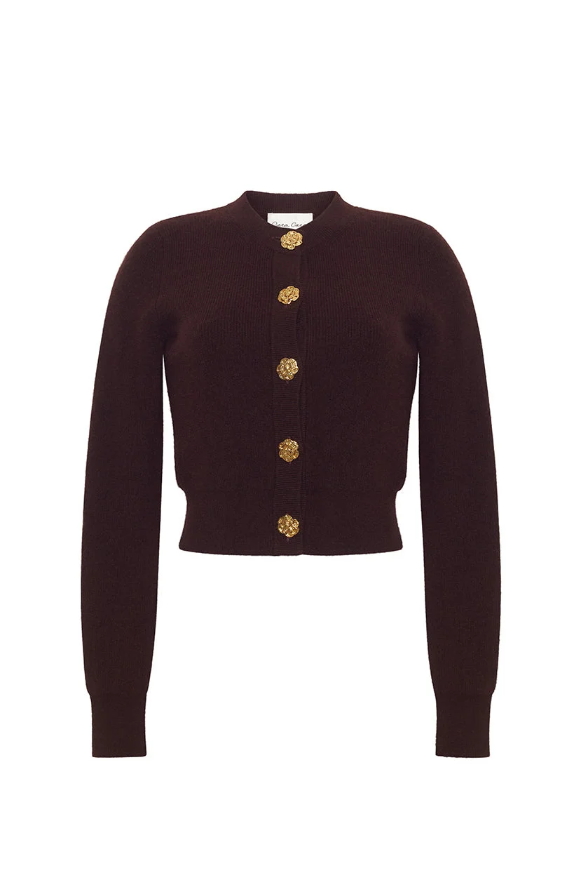 • Crewneck fitted long-sleeve cardigan with novelty gold floral buttons This garment is special and might stretch over time if hung. To preserve its shape, we recommend taking extra care and folding. Details • 70% Wool 30% Cashmere • Dry Clean Only or Hand Wash Cold • Made in China