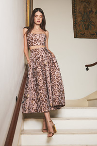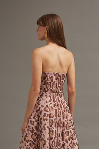 • Strapless bustier top featuring a cropped silhouette, sweetheart neckline and boned bodice • Zip closure at back with hook and eye closure • Bodice is fully lined in poly stretch • Front and back princess seams • Animal woven jacquard in rose gold and blush • Jacquard pattern is placed This fabric is very special and should be treated with extra care to preserve its beauty. To prevent snagging, we recommend using a garment cover and to avoid storing next to items that may cause damages such as sequins, rhinestones, or embroidery. Alternatively, consider hanging on a padded hanger. Details • 85% Poly 10% Metallic 5% Nylon; 100% Poly Lining • Dry Clean Only or Hand Wash Cold • Made in China