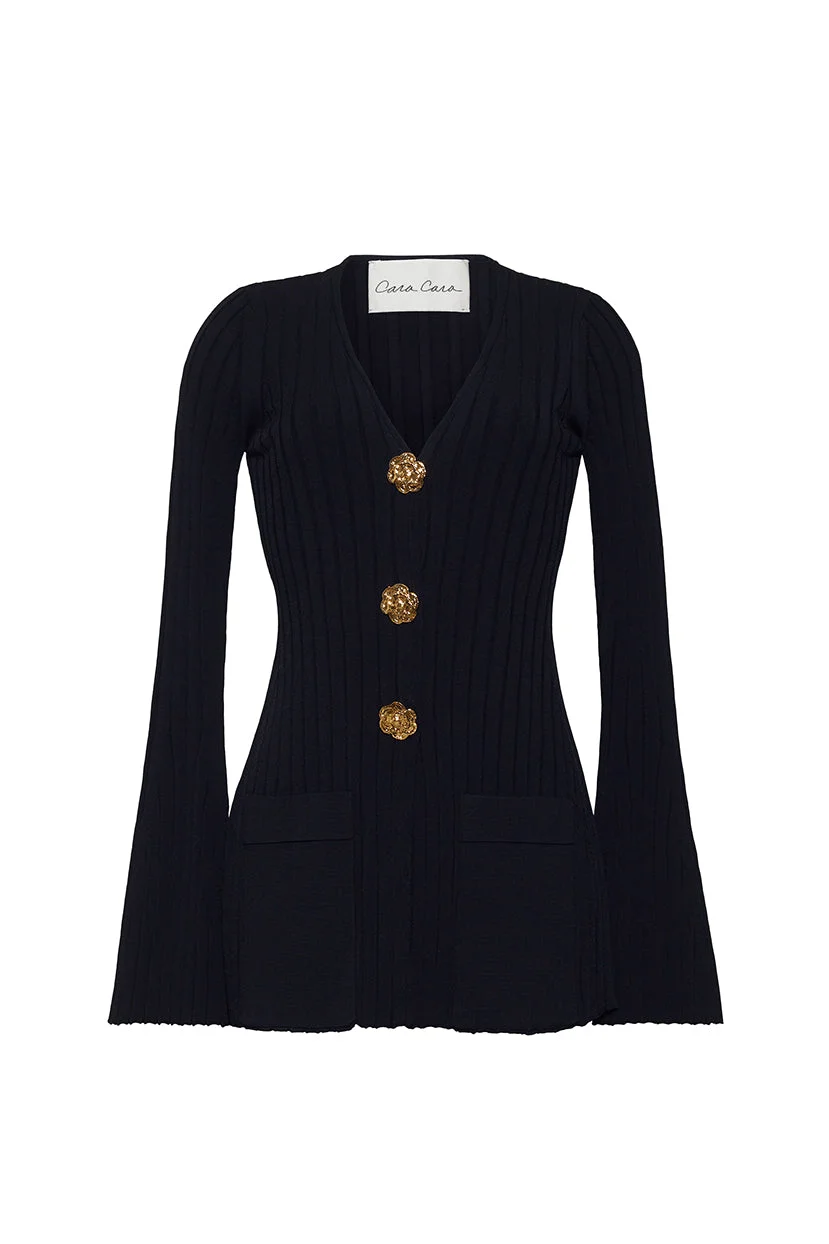 • Tunic length, V-neck, long flare sleeve rib top with non-functional gold flower shank buttons • Patch pockets at side front • Slits at sleeve hem • Rib knit This garment is special and might stretch over time if hung. To preserve its shape, we recommend taking extra care and folding. Details • 83% Viscose 17% Poly • Dry Clean Only or Hand Wash Cold • Made in China