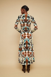 The Maisy Dress emulates chic freshness with a bold print. Rendered in slinky jersey, this flattering A-line midi’s ruched bodice and lean sleeves offer day-into-cocktail versatility for every occasion. • Slinky jersey • Invisible back zip with hook-and-eye closure • Shirred ruching at center front, center back and side-seams • Placed print This garment is special and might stretch over time if hung. To preserve its shape, we recommend taking extra care and folding. Details • Slinky Jersey 93% Viscose 7% Spandex • Dry Clean Only or Hand Wash Cold • Made in China