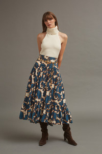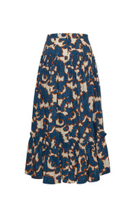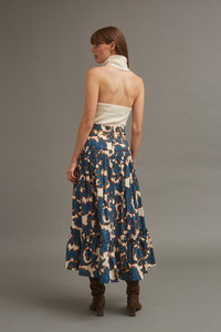 The Tisbury Skirt balances a bohemian spirit with a polished fit. The high-low, tiered ruffle skirt has just enough volume to feel special while being casual enough to knot your favorite t-shirt on top for a playful look. A-line silhouette with a wide yoke at the high-rise waist. Concealed zip fastening along back. Allover print. Details • 100% Cotton Poplin • Dry Clean Only or Hand Wash Cold • Made in China