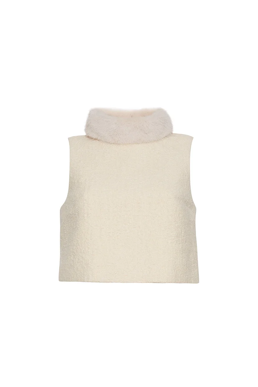 • Sleeveless Italian boucle shell top with detachable faux fur collar • Fully lined • Center back invisible zipper • Removable collar has fur hook-and-eyes and clear buttons with bungee loops to attach to shell • Front has bust darts for fitted look Details • 70% Cotton 25% Wool 5% Poly; Faux Fur 100% Poly • Dry Clean Only or Hand Wash Cold • Made in China