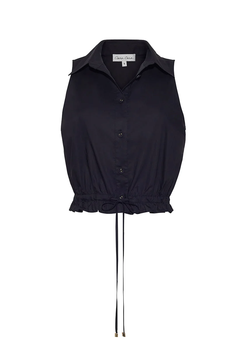 • Collared button down halter top • Cinches in at waist with functional tie detail with gold cord ends • Partially elasticated waist • Center front button down opening • Ruffle detail at hem • Designed for an easy look • Unlined Details • 100% Cotton Poplin • Dry Clean Only or Hand Wash Cold • Made in China
