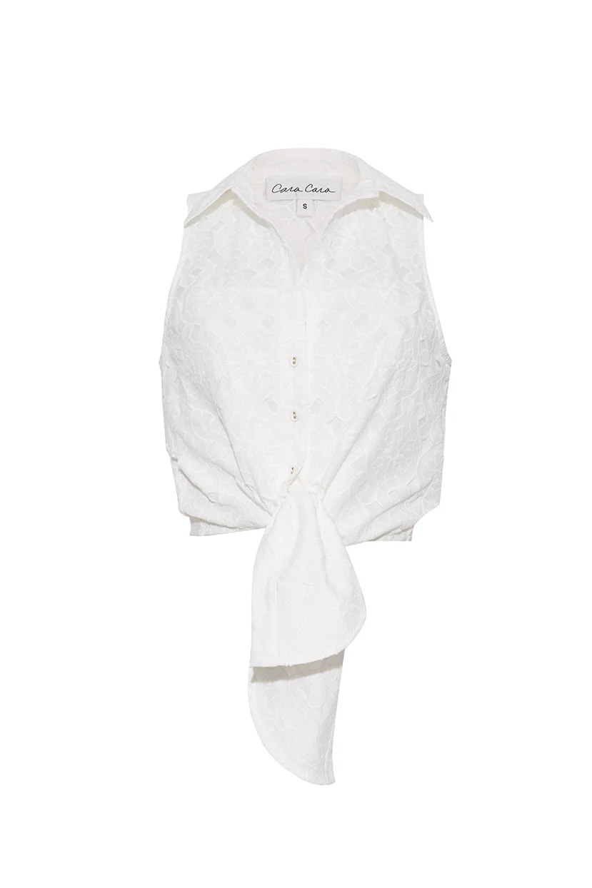 • Sleeveless eyelet button down shirt with functional front ties • Functional center front placket • Elastic at back hem for ease • Ties can be adjusted for your liking • Halter neckline • Interior shoulders have snaps with crochet loops for bra holders • Placed eyelet • Lined at front and back bodice Details • 100% Cotton • Dry Clean Only or Hand Wash Cold • Made in China