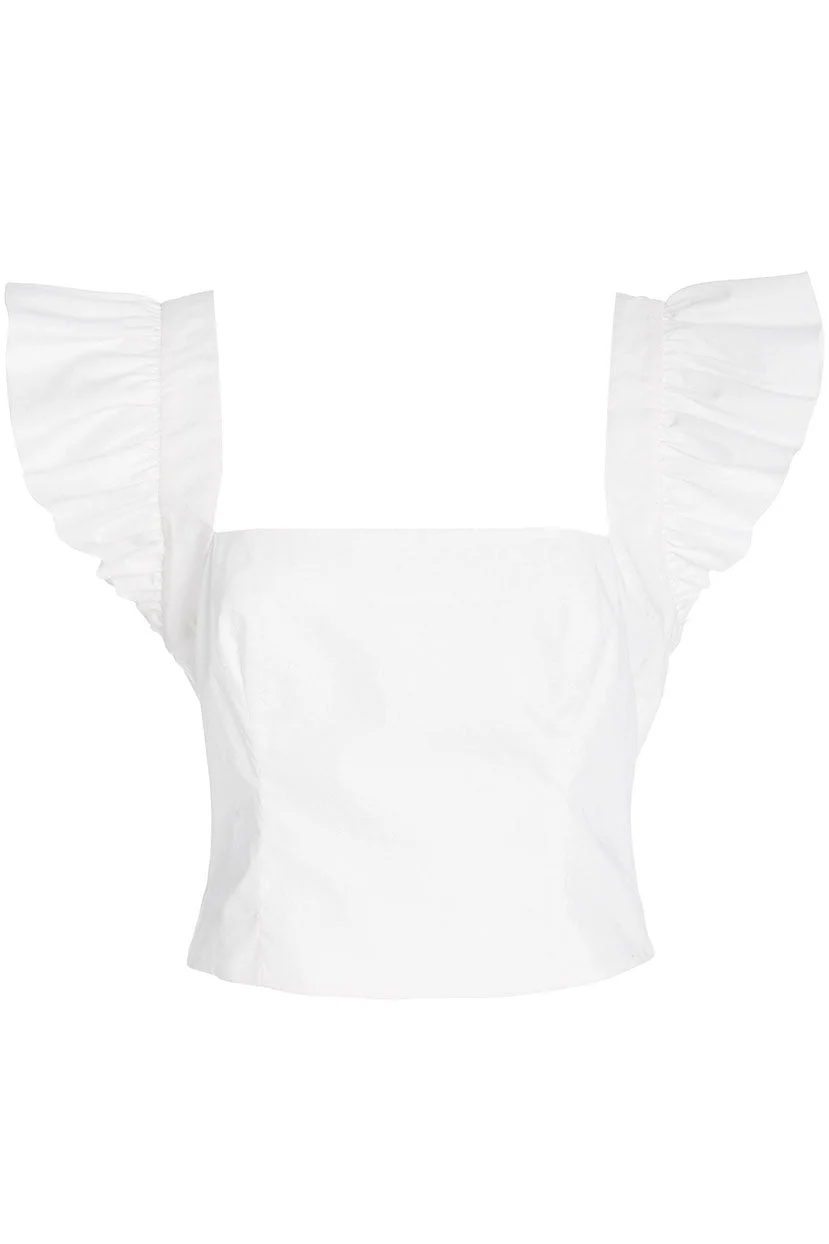 The Hyannis top is designed from crisp cotton-poplin with a square neckline and ruffled trim at the straps adding a flirty touch to this versatile piece. Concealed zip fastening along back. Slight v dip in back. Fitted. Details • 100% Cotton Poplin • Dry Clean Only • Made in China