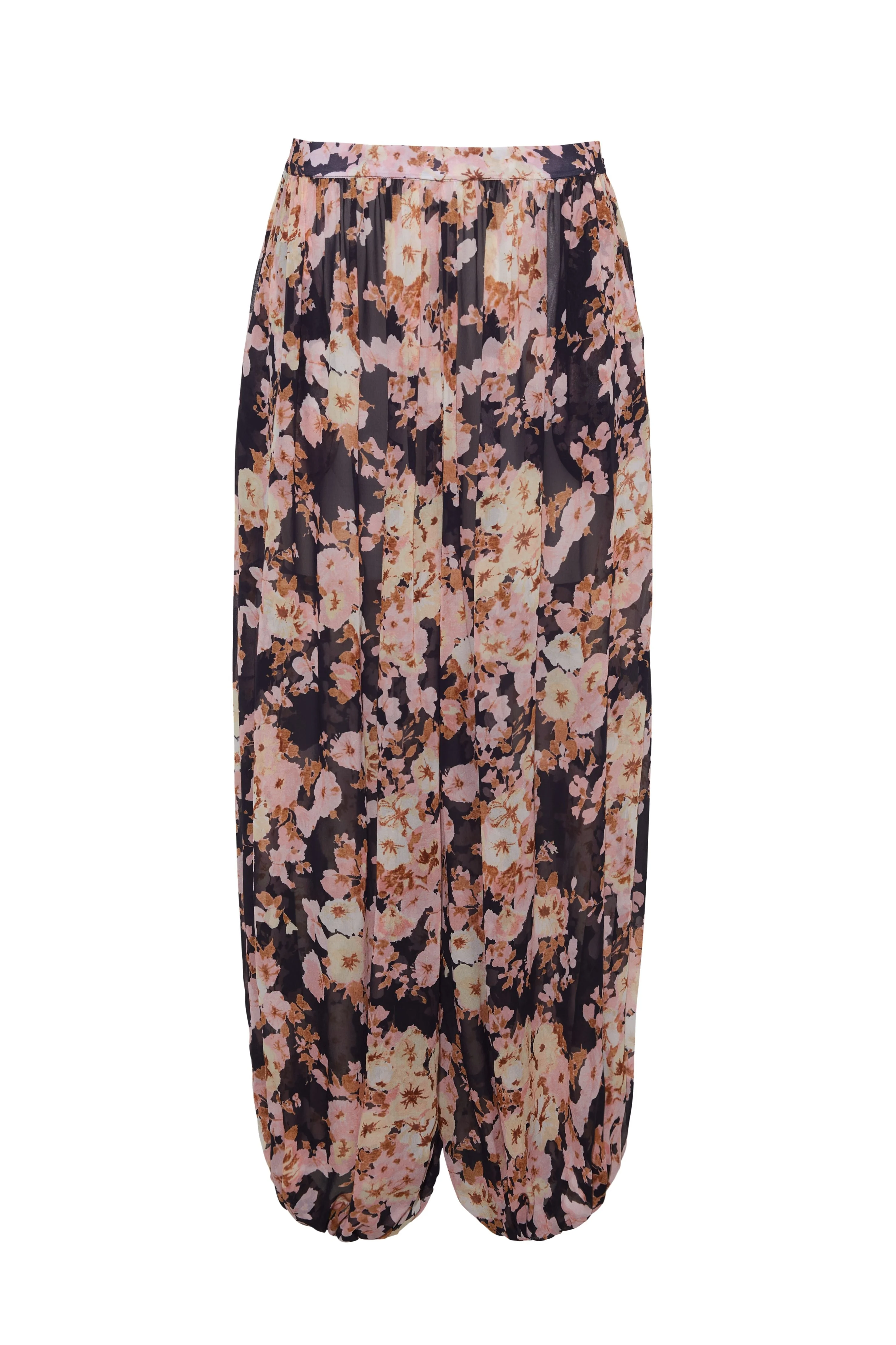• True classic harem pant • Billow below waistband and end with elasticated leg openings • Functional side-seam pockets • Elastic encased at center back of waistband • Invisible zipper and hook-and-eye at top edge at wearers left • Half lined • Allover print Details • 100% Silk; 47% Viscose 53% Rayon Lining • Dry Clean Only or Hand Wash Cold • Made in China