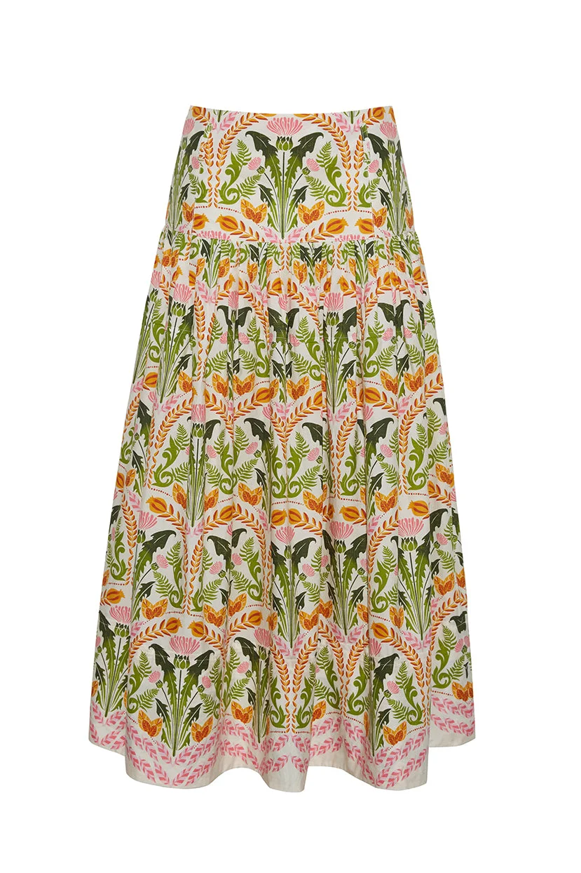 • Tiered midi skirt • Center back zipper opening with hook-and-eye closure • Fitted to waist and flares out • Functional side seam pocket bags • Belt loops for separate sash to loop through • Separate sash has decorative top stitching detail • Fitted yoke has decorative top stitching detail • Placed print at skirt and sash • Skirt yoke is fully lined Details • 100% Cotton Poplin, 100% Cotton Voile Lining • Dry Clean Only or Hand Wash Cold • Made in China