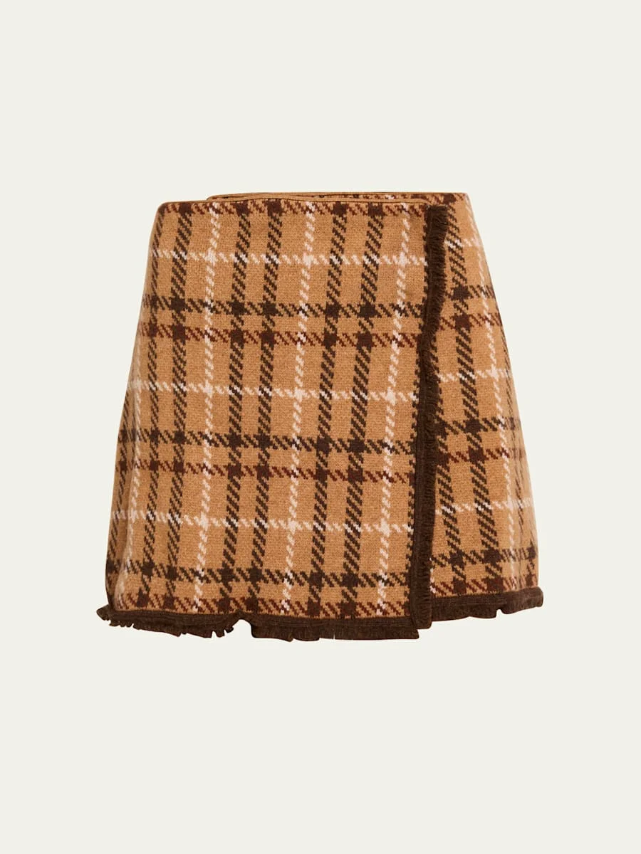 Crafted in plaid merino wool, the "Jodi" mini skirt by Cara Cara features a wrap front finished with contrasting fringe trim. High rise Skirt falls straight from hip to hem Hem falls above the knee Wrap closure Merino wool Dry clean Imported Online Inquiries: BGS21_T8QCD| Store Inquiries: #5357233