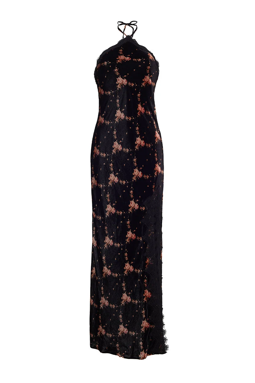 • Bias halter maxi dress in silk velvet with lace adorning the halter neckline and slits at skirt • Self spaghetti ties with gold cord ends to tie around neckline • Scoop at back • Center back invisible zipper with hook-and-eye closure at top opening • Internal elastic at back neck for adjustability • Fully lined • Allover print Details • 82% Rayon 18% Silk • Dry Clean Only or Hand Wash Cold • Made in China