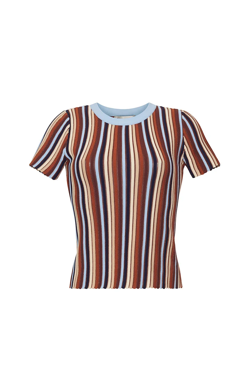 • Crewneck short-sleeve fitted pullover top with contrast trim • Novelty stripe stitch with metallic This garment is special and might stretch over time if hung. To preserve its shape, we recommend taking extra care and folding. Details • 80% Viscose 20% Nylon + Lurex • Dry Clean Only or Hand Wash Cold • Made in China