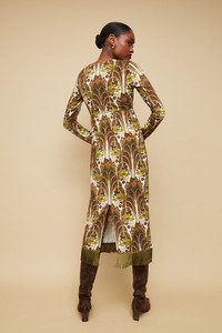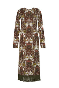 The Liza Dress features a long sleeve fitted top. The structured top cuts an elegant silhouette and the fringe details take the dress to the next level. • Slit at center back of skirt for an easy fit • Zip fastening along back • Placed print • Fringed border at hem Details • 50% Cotton 50% Modal • Dry Clean Only or Hand Wash Cold • Made in China