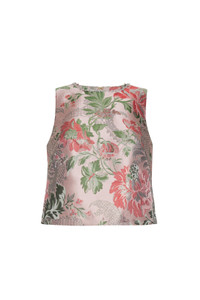 • Easy crewneck sleeveless shell top in vintage floral jacquard with embellished novelty rhinestone with silver metal trim around neckline • Center back zipper opening with hook and eye closure • Slightly cropped, boxy fit • French darts at front bodice • Fully lined Details • 100% Poly; 100% Acetate Lining • Dry Clean Only or Hand Wash Cold • Made in China