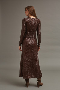 The Maisy Dress emulates chic freshness with a bold brown sequin. • A-line midi with ruched bodice and lean sleeves • Sequin mesh with mesh lining • Invisible back zip with hook-and-eye closure • Shirred ruching at center front, center back and side-seams This garment is special and might stretch over time if hung. To preserve its shape, we recommend taking extra care and folding. Details • 97% Poly 3% Spandex • Dry Clean Only or Hand Wash Cold • Made in China