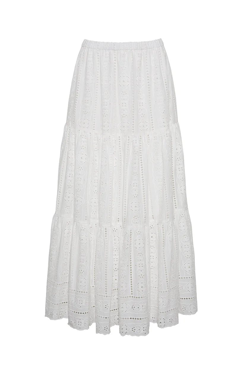 The Melanie is perhaps our most effortless skirt. The elastic waist and tiered silhouette flatter the figure and provide multiple styling options. Pair with our matching Perrin Top in the same eyelet for a fresh resort look or dress down with a white tee and kicks. Details • 100% Cotton • Dry Clean Only or Hand Wash Cold • Made in India