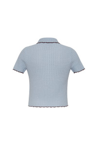 • Shrunken pointelle stitch short sleeve polo with contrast tipping and functional button placket • Decorative raffia buttons and grosgrain facing This garment is special and might stretch over time if hung. To preserve its shape, we recommend taking extra care and folding. Details • 100% Extra Fine Merino Wool • Dry Clean Only or Hand Wash Cold • Made in China
