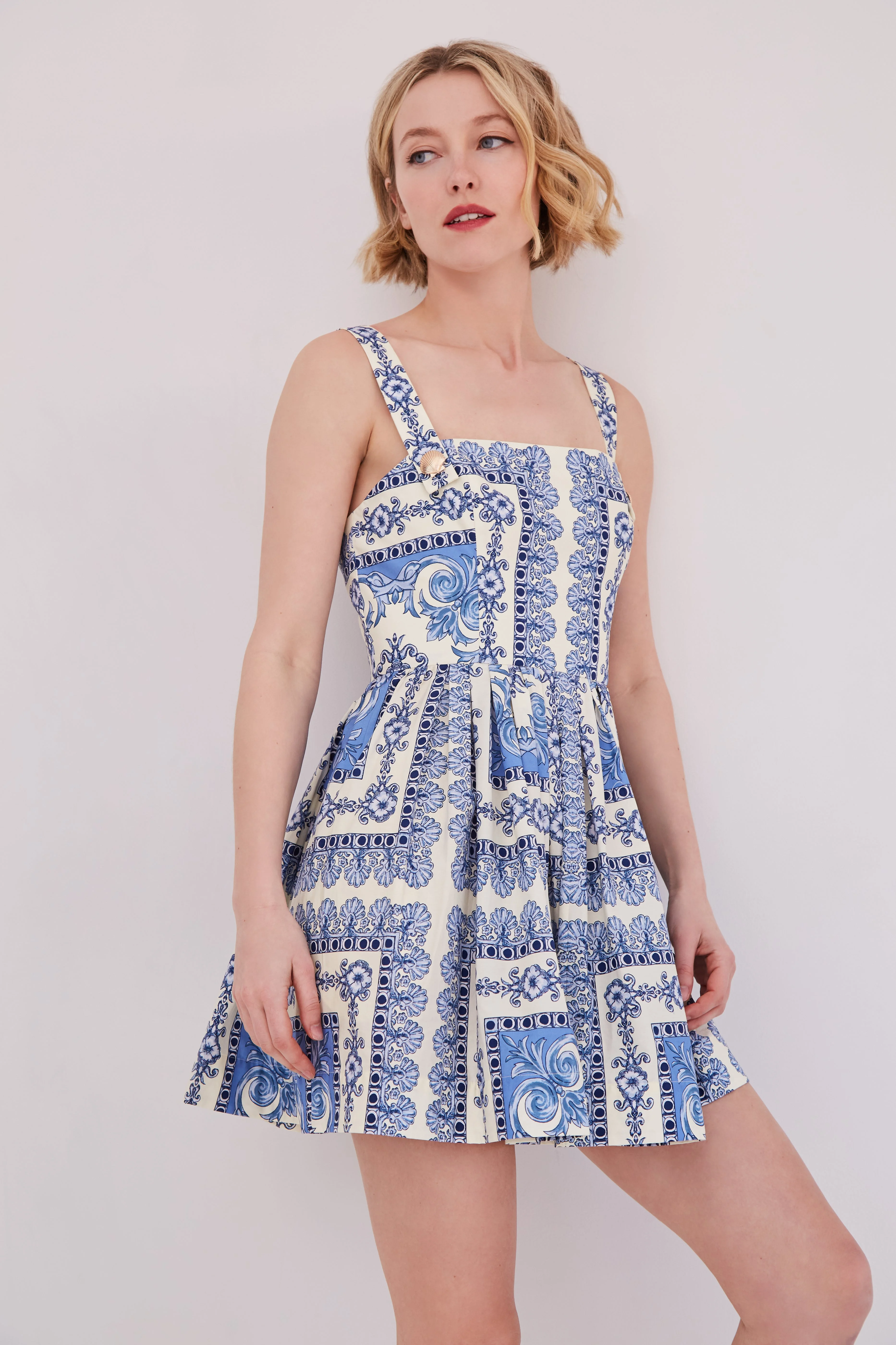 • Fit-and-flare mini dress • Garment features a structured bodice with boning at side seams • Back bodice has an elastic smocked panel for easy fit • Center back zipper with hook-and-eye closure • Functional side seam pocket bags • Bodice is fully lined in cotton voile • Placed print • Skirt has shirring and tucks at waist • Combo trim artwork at straps with strap overlap at front with a non-functional novelty seashell button sewn through and through • Straps have elastic at back Details • 100% Cotton Poplin, 100% Cotton Voile Lining • Dry Clean Only or Hand Wash Cold • Made in China