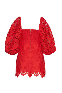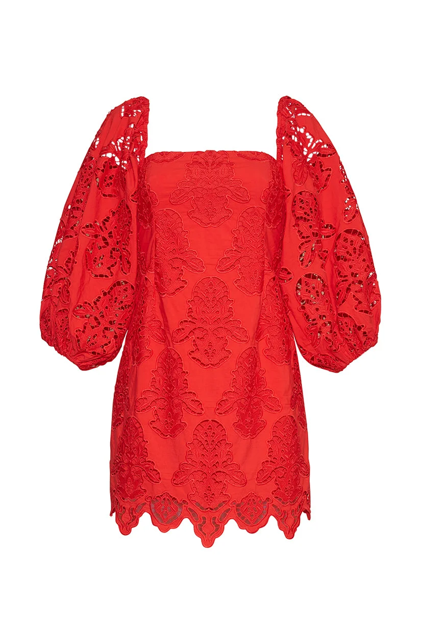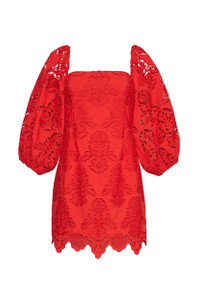 • Square neck mini dress with a blouson 3/4 sleeve • Designed for a fitted look with a slightly a-line skirt • Garment features back body smocking panel for ease • Front and back darts for a more fitted look • Center back zipper opening with hook and eye closure • Elasticated shoulder and cuff opening • Garment is fully lined except for sleeves • Garment features a decorative scallop hem detail • Placed eyelet Details • 100% Cotton; 100% Cotton Voile Lining • Dry Clean Only or Hand Wash Cold • Made in China