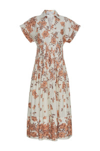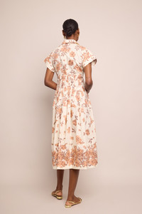 • Midi length shirt dress designed for fit and flare look • Functional center front placket opening • Functional side seam pockets • Decorative top stitching detail at skirt yoke and bottom hem • Pin tucks at waist • Sleeve opening has double rolled cuff • Baby snaps at internal placket for additional security • Unlined • Placed print Details • 100% Cotton Poplin • Dry Clean Only or Hand Wash Cold • Made in China